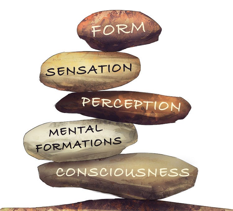 To further elucidate the nature of the self, Buddhism introduces the concept of the Five Aggregates, or “skandhas.” These are the components that constitute human existence: